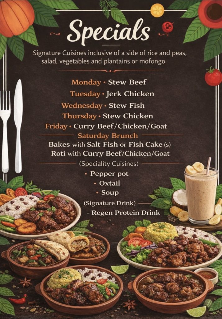 Carib Royale is a Caribbean Inspired Restaurant consisting of the fusion of Guyanese/Saint Lucian and Caribbean Cuisines that is available daily (Monday-Saturday) via freshly prepared daily specials, catering services and or meal prep all of which is available for delivery (Delivery Hours 11:00am-12:30pm). Carib Royale specializes in the formulation of traditional cuisines that evokes the sense of taste (distinguishing subtle flavors and refined palates). CR’s signature cuisines consists of Stew Beef, Jerk Chicken, Stew Fish, Stew Chicken and Curry Beef/Chicken/Goat whereas its specialty cuisines consists of Pepper Pot, Oxtail and Soup. Furthermore, Carib Royale’s Signature Spice Blends consists of Nightshade and Sunday Seasoning and it’s signature drink is Regen’s End Result Protein Drink. On the other hand, Carib Royale offers delivery services within Allen Texas Zip code 75002 and a 5-mile radius of 75002 (Collin County TX) primarily include other parts of Allen nearby areas of Plano, McKinney, Frisco and Lucas with common neighboring ZIPs being 75013, 75074, 75025, 75094, 75098, 75069 and parts of 75023. Additionally, Carib Royale utilizes/accepts the digital payment method of Zelle only, orders are submitted online only inclusive of advance submissions.